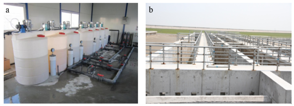图4 (a)吸附剂在线制备与投加系统(加药间);(b)吸附沉淀反应池.