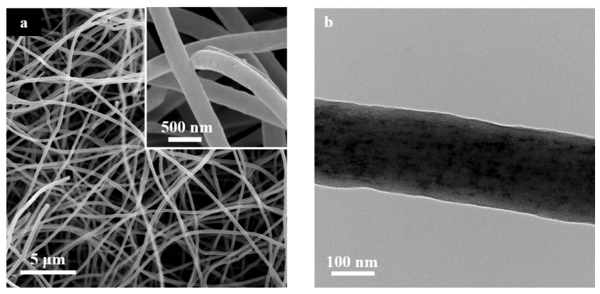 图1 (a) LCNFs不同放大倍数的扫描电镜图;(b) LCNFs的透射电镜图.