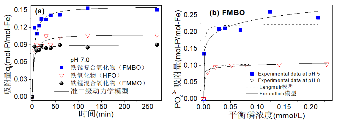国内外研究认为,只要水体可溶性磷高于0.01mg/L,藻类生物量就不会降低,为控制富营养化的发生,需尽量将水体磷浓度控制在0.01mg/L以下。本研究以磷酸二氢钾和单磷酸腺苷分别作为无机磷和有机磷的模拟污染物,以水处理中常用的铁、铝、锰等的化合物为原料,采用简单易行的氧化还原-共沉淀法,研制出以铁氧化物为主组分的具有纳米结构的二元铁锰复合氧化物(FMBO)、铁钛复合氧化物和三元铁铝锰复合氧化物等金属氧化物。通过同步投加Fe2+和KMnO4生成新生态Fe3+、铁氧化物和锰氧化物等活性物种,探索了其物化特征、吸附性能及界面反应机理,开发出Fe2+-KMnO4原位除磷工艺。图1(a)给出了铁锰复合氧化物、铁锰混合氧化物和铁氧化物三种新生态金属氧化物在中性pH条件时随时间变化的磷吸附量对比,可见,新生态铁锰复合氧化物显示出优良的磷吸附效果和吸附速率。图1(b)为不同pH时的吸附等温线对比,表明弱酸性条件的磷吸附容量高于弱碱性条件,新生态铁锰复合氧化物与普通金属氧化物的pH影响特性具有相似性。