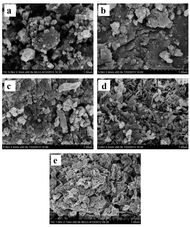 (a)Fe/La 1:0、(b)Fe/La 3:1、(c)Fe/La 1:1、(d)Fe/La 1:3和(e)Fe/La 0:1.