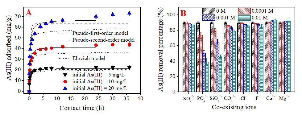 为有效提高吸附材料对As(III)的去除效率,我们构建了一种无定型纳米钛锰复合氧化物,该材料对As(III)有较高的吸附容量(86.3 mg/g)(图2A);相较于Langmuir模型,Freundlich模型可以更好的描述实验数据,说明无机As(III)在钛锰复合氧化物表面发生非均质的多分子层吸附;钛锰复合氧化物对As(III)的吸附速率很快,在2 h内可完成平衡吸附量的90 %以上;准二级动力学方程比准一级动力学方程、Elovich方程更适合拟合As(III)的吸附过程,说明As(III)的吸附过程发生了化学吸附(图3A);而在As(III)的吸附过程中同步检测到了As(V)的产生,间接证明了As(III)在固/液界面发生氧化还原反应,被氧化成As(V) (图2B);水体中常见阴、阳离子中只有SiO32-和PO43-对As(III)去除效能抑制较显著,可能是因为发生了竞争吸附(图3B);而且,钛锰复合氧化物材料可应用的pH范围较宽,再生性能良好,可在实际水处理工艺中循环使用。