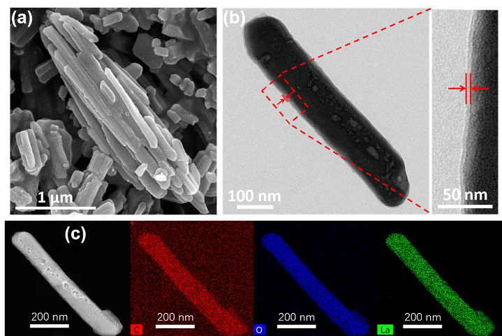(c) C-La-MOF的高角环形暗场图(HAADF)及C、O、La元素分布能谱.