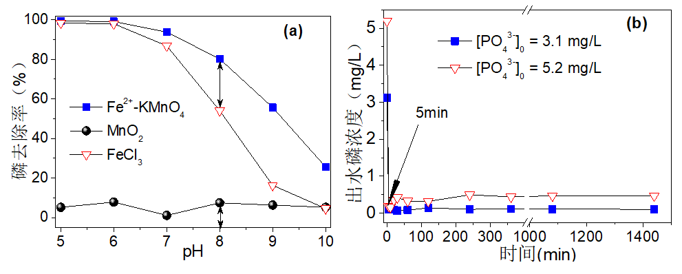 (b)反应时间对Fe2+-KMnO4工艺除磷的影响.