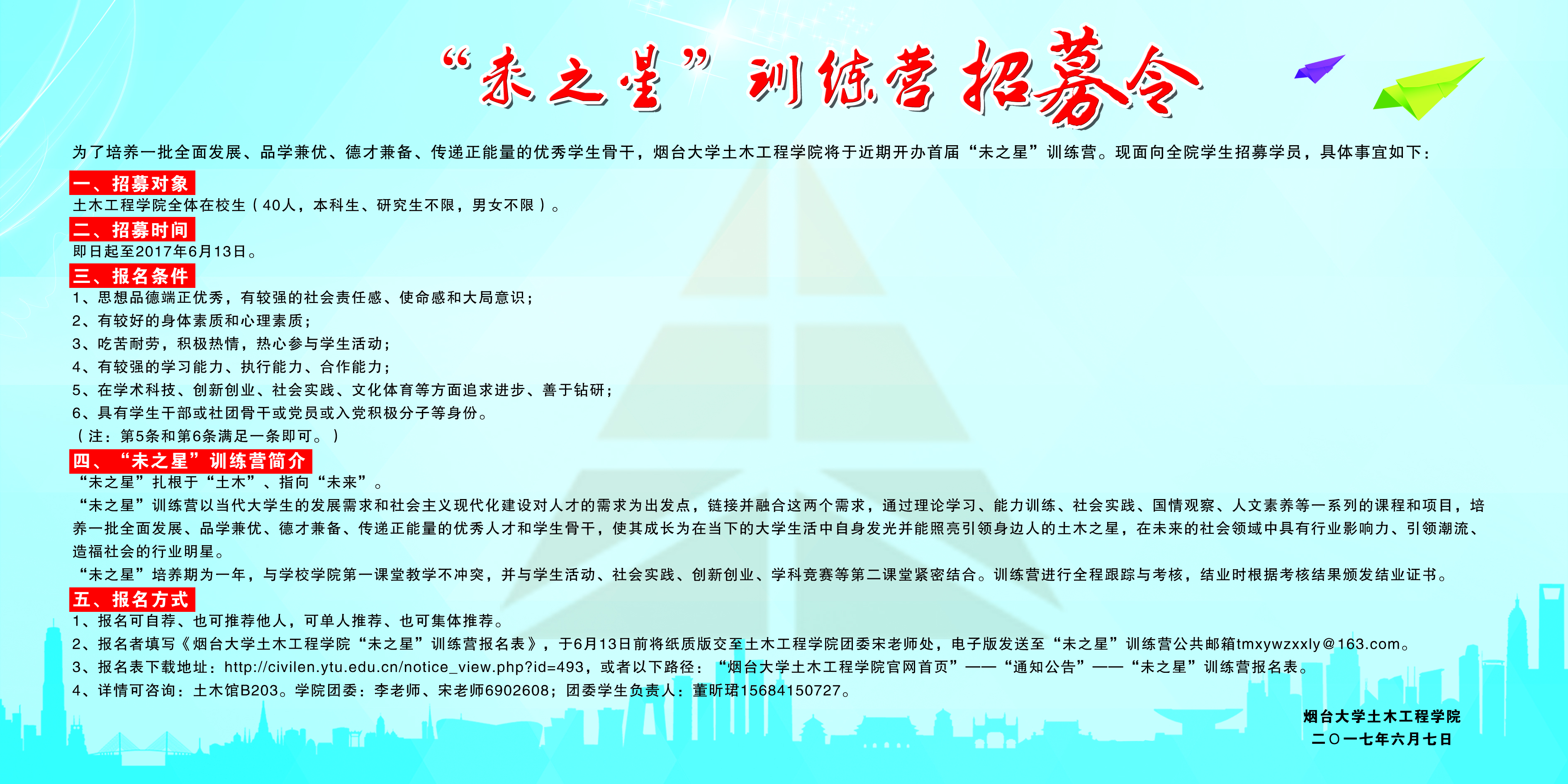“未之星”训练营以当代大学生的发展需求和社会主义现代化建设对人才的需求为出发点,链接并融合这两个需求,通过理论学习、能力训练、社会实践、国情观察、人文素养等一系列的课程和项目,培养一批全面发展、品学兼优、德才兼备、传递正能量的优秀人才和学生骨干,使其成长为在当下的大学生活中自身发光并能照亮引领身边人的土木之星,在未来的社会领域中具有行业影响力、引领潮流、造福社会的行业明星。