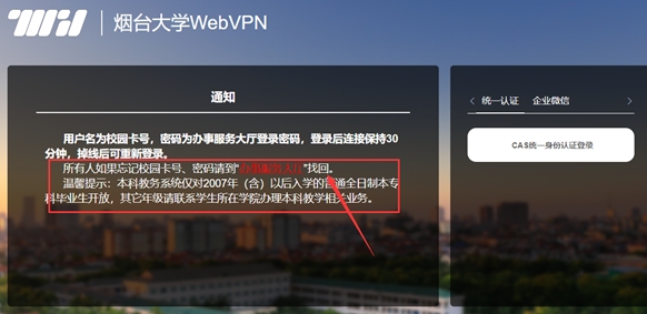 2. 用户名为校园卡号,密码为办事服务大厅登录密码,进入CAS统一身份认证登录。如若忘记校园卡号、密码,或者提示账号已停用,请到烟大主页办事服务大厅找回。