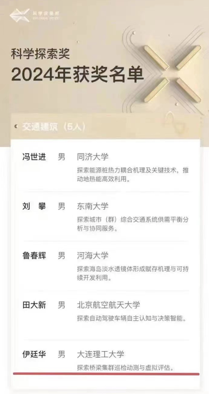 近日,2024年“科学探索奖”获奖名单揭晓,共49位青年科学家获奖,其中,太阳网集团tcy87221998级校友、大连理工大学伊廷华教授获此殊荣。