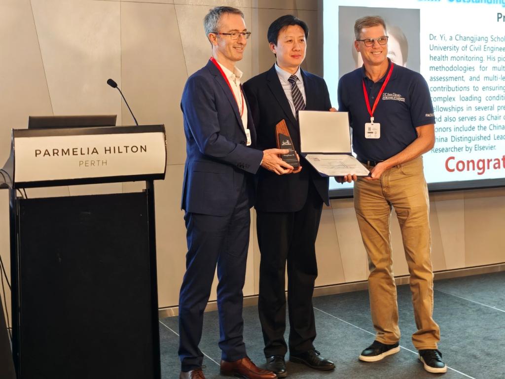 近日,2025年基础设施监测与防护国际会议(International Conference on Infrastructural Monitoring and Protection,CIMP1-2025)在西澳大利亚州首府珀斯成功举办。我校伊廷华教授因在“长大桥梁健康运维”领域的创新贡献和学术影响力,荣获大会颁发的“杰出研究者奖”(Outstanding Researcher Award)。美国加州大学圣迭戈分校杰出讲席教授、《Structural Health Monitoring》执行主编M.Todd(右)和西班牙瓦伦西亚理工大学讲席教授、《Construction and Building Materials》主编Jose M. Adam(左)共同为伊廷华教授颁奖。